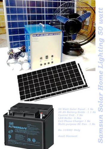 Samsun 50 W Off-Grid Solar Home Lighting System provides DC power for LED lights, fans, and mobile charging. It offers up to 6 hours of light backup and 10 hours of fan operation, ideal for homes and small shops.