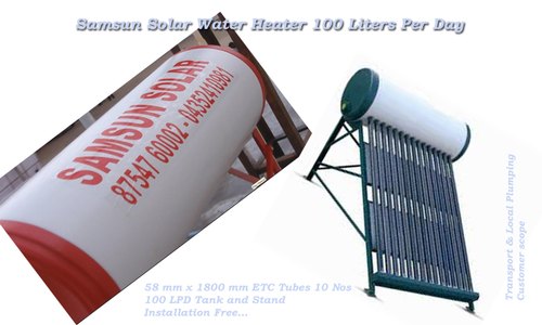 Samsun Solar Water Heater features a heavy-duty 2–3 mm hot dip galvanized inner tank with a 5-year replacement warranty and a lifespan of up to 20 years. It delivers maximum heating up to 100 °C using high-efficiency ETC tubes for 360° heating. Installation is available across Kumbakonam, Thanjavur, Myladuthurai, Chidambaram, Jayankondam, Ariyalur, Perambalur, Thiruvarur, Nagapattinam, Pattukottai, Orathanadu, Papanasam, Ayyampettai, and Thiruvaiyaru.